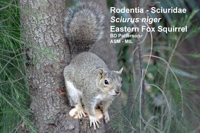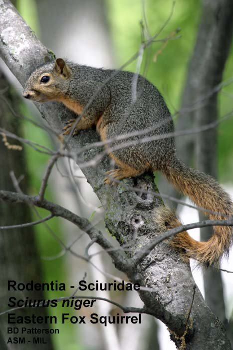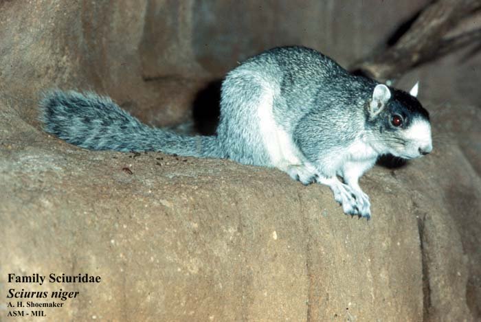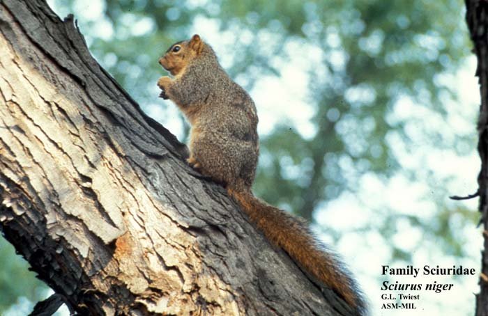 Woodland dweller, occupying forest edge habitat; prefers open woodland. Largest tree squirrel in U.S. Color variation. 3 subpspecies. Numbers reduced due to hunting and habitat alteration. More brown or rusty than gray squirrel.