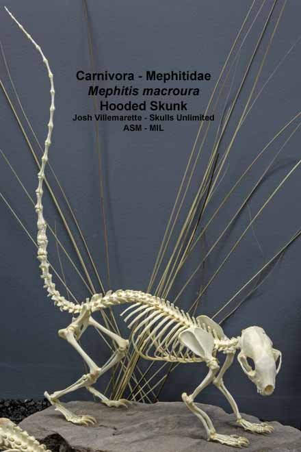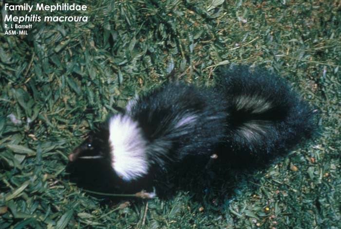 Similar to striped skunk in appearance, with more white over head, neck, and back. Shares its range with other skunks. More common in Mexico. Often associated with stream banks and washes.