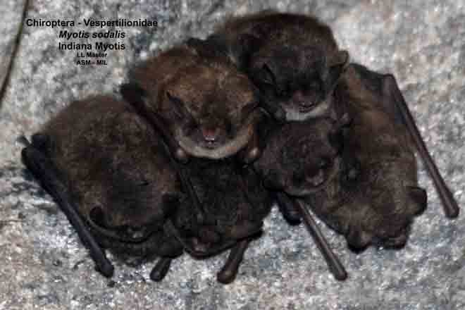 Federally endangered. Grayish-brown; hibernates in huge, isolated colonies.