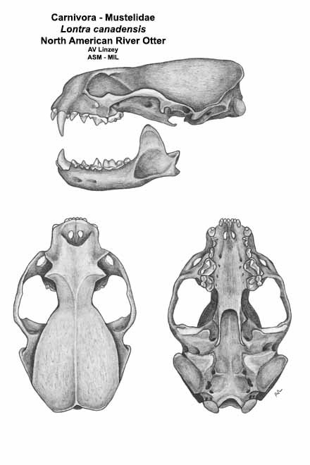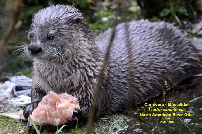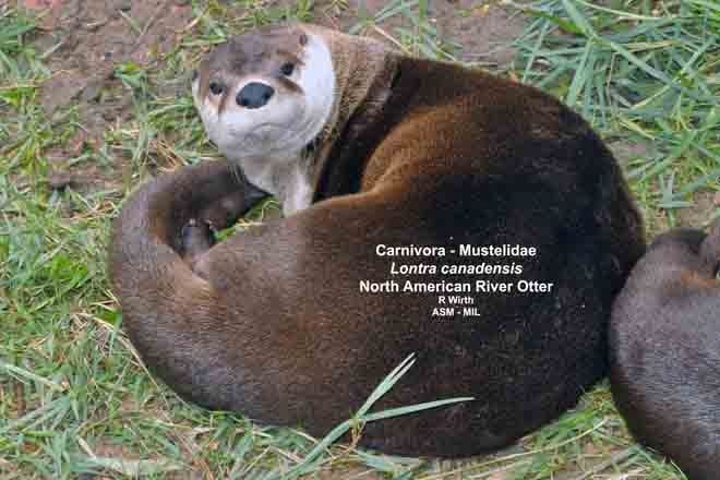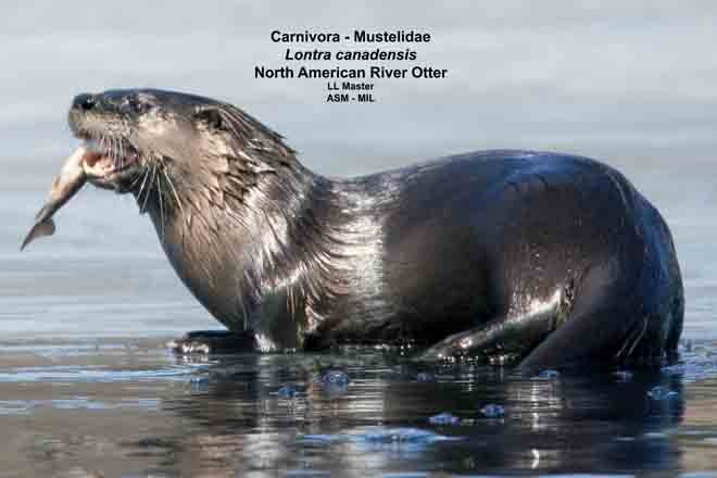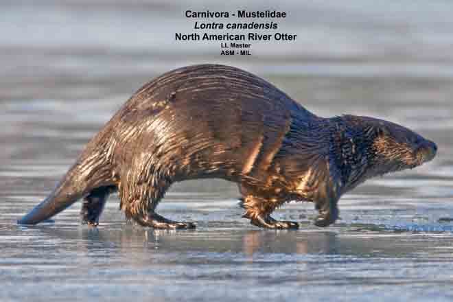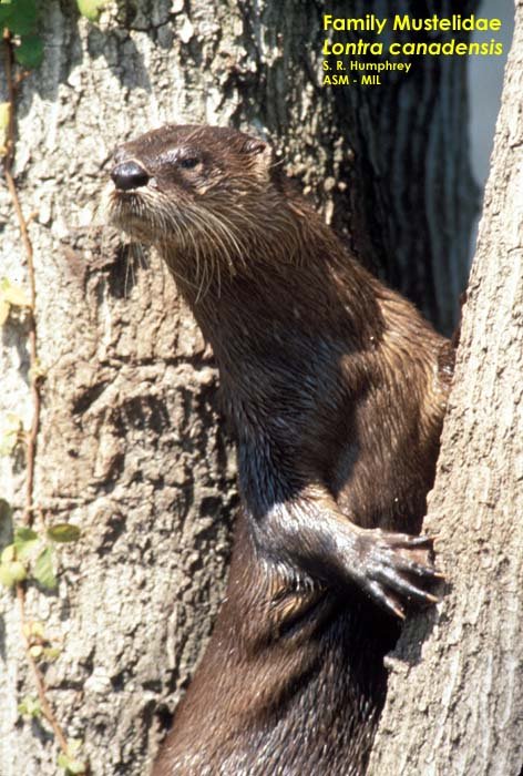 Slide symbol: A -- anatomical specialization. W -- female with young. Aquatic (including slightly salty & marsh water), but easily run on land. Playful; make slides on riverbanks.