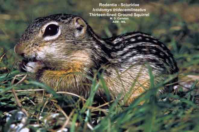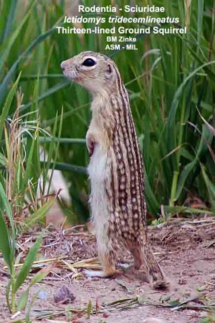 Nearly half the year may be spent in hibernation. Abundant along rights-of-way and roadsides. Hibernates up to six months. Small with (usually) 13 alternating dark (w/spots) & light stripes. Found in grassy or open wooded or shrubland.