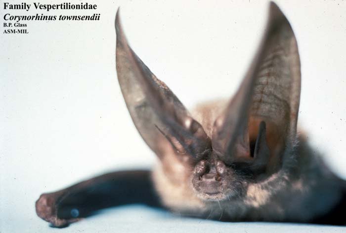 TRIBE Plecotini; *Status is Vulnerable as Plecotus townsendii; Endangered as P. ingens and P. virginianus. Live & hibernate (singly or in groups) in gypsum caves & caverns under granite boulders. May forage close to ground. Cavernicolous