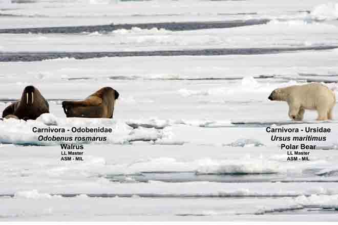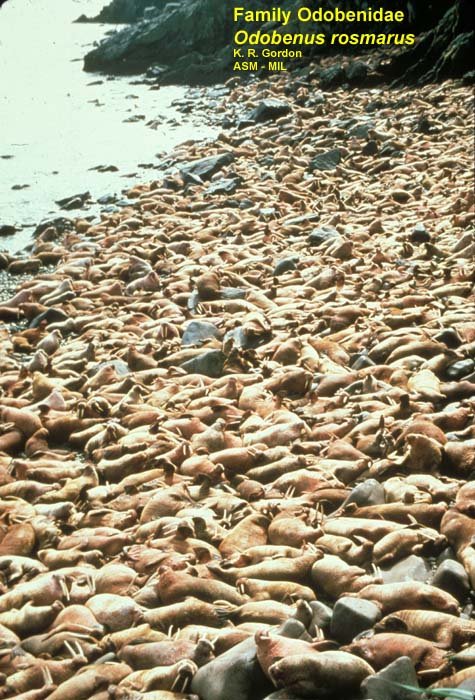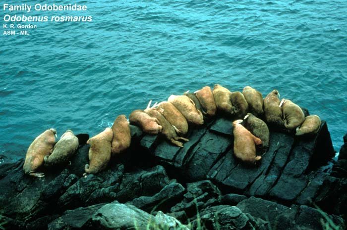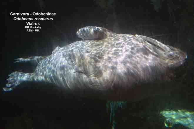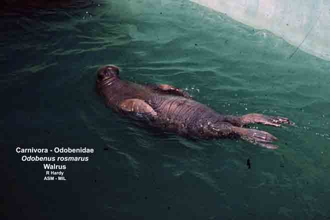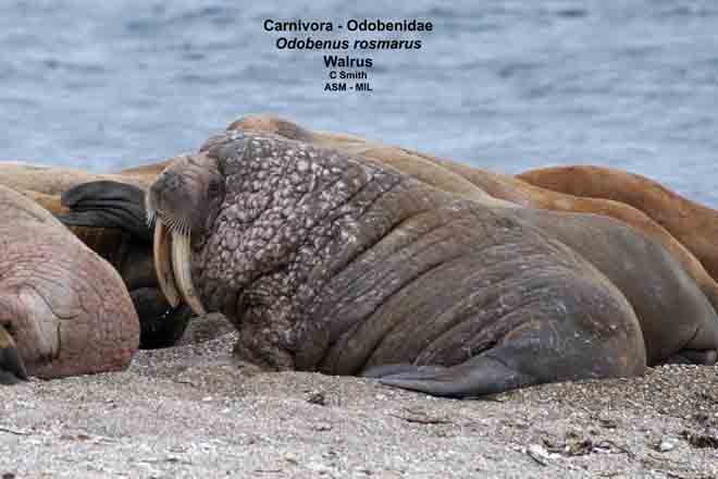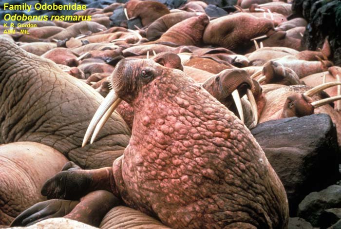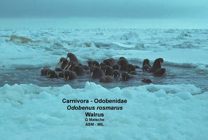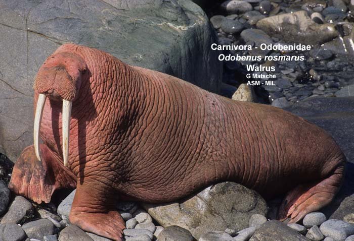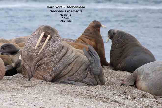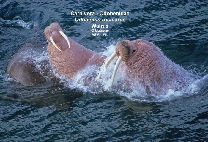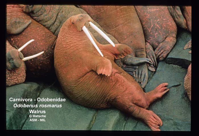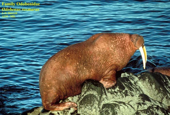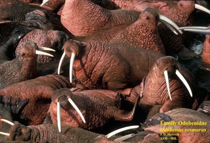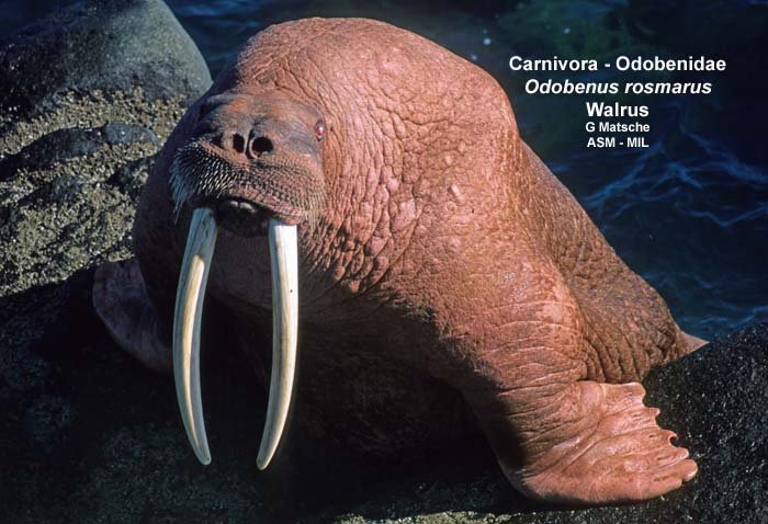 Walruses are essentially bottom feeders, subsisting on a broad array of invertebrates. They do on occasion feed on fish, seals, and young whales. Though larger in males, both sexes possess tusks. Tusks are used in dominance and territorial battles.